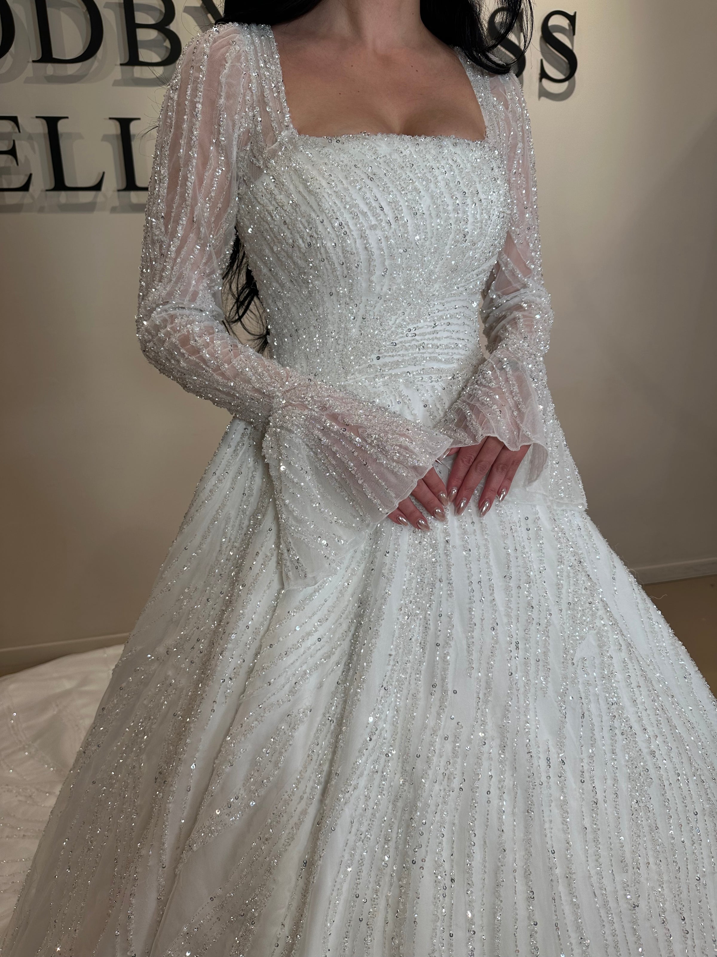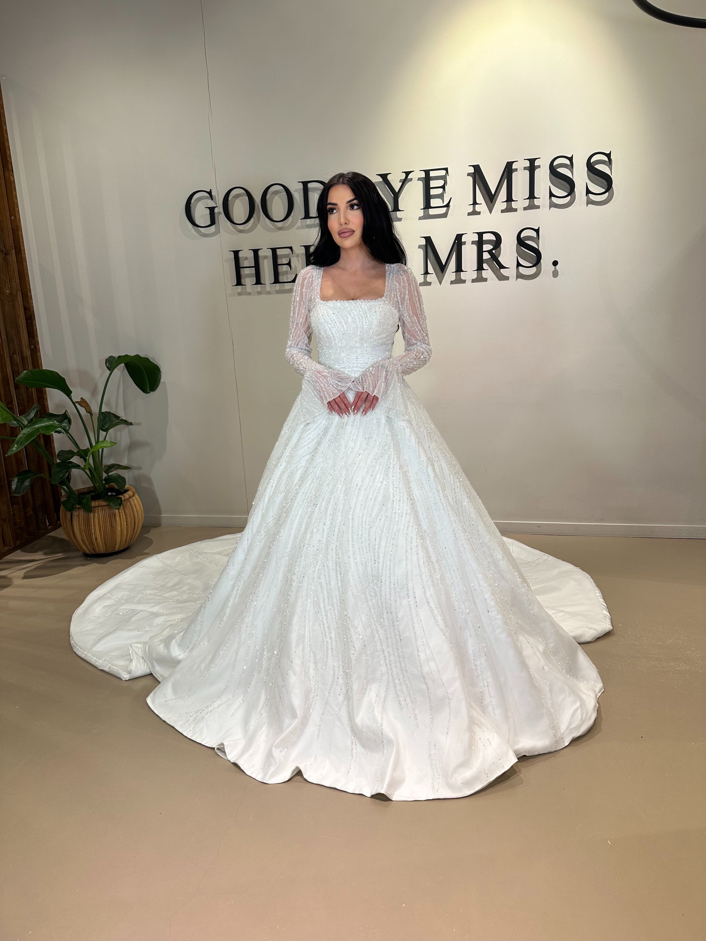 Deze prachtige Insila wijd jurk is een echte regelrechte bestseller en dat is niet voor niets. De jurk heeft een elegante vierkante neklijn, een wijd uitlopende rok en is rijkelijk afgewerkt met prachtig bewerkt kant, wat zorgt voor een romantische en luxe uitstraling.