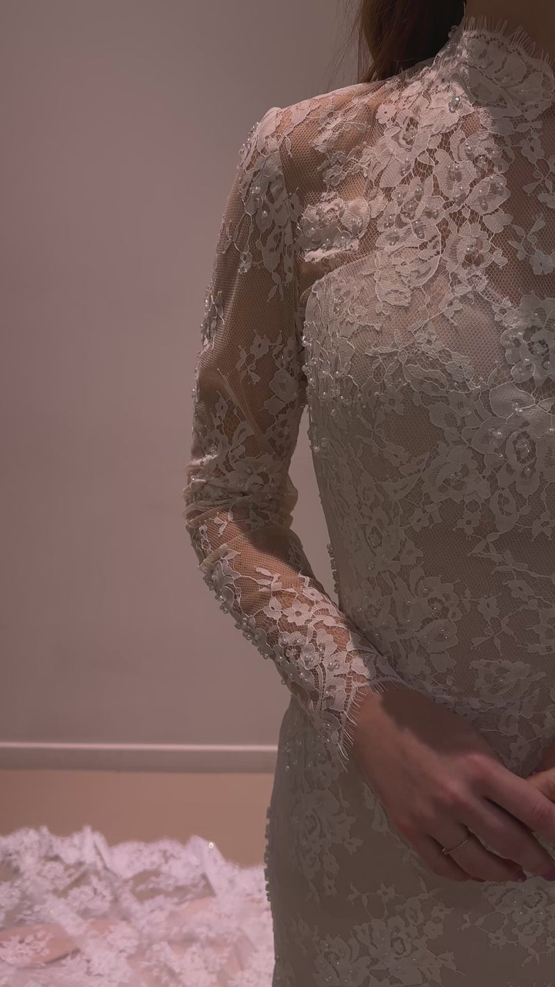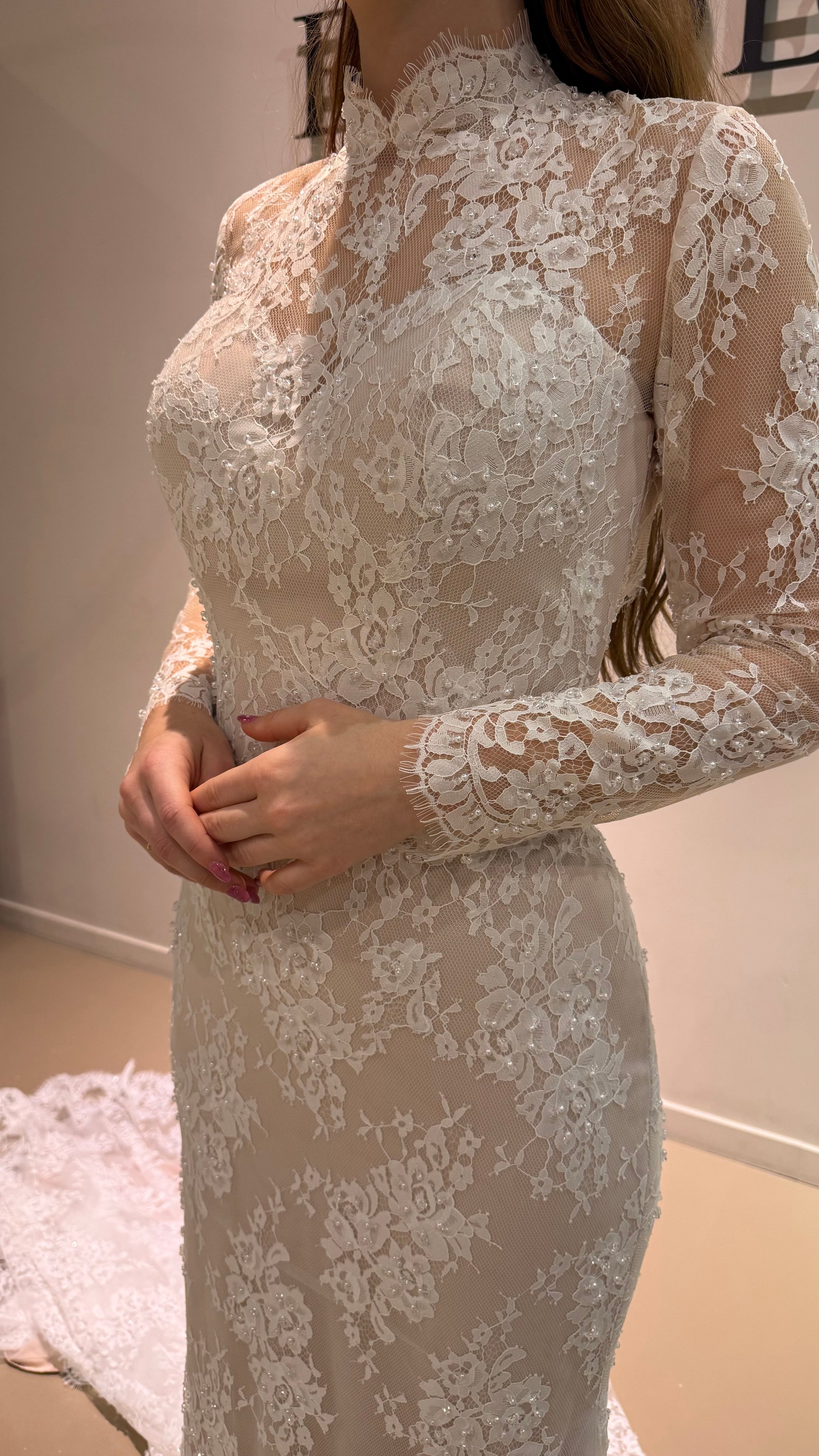 Het ontwerp heeft een elegante trompetvorm die het silhouet volgt en vanaf het bovenbeen uitloopt in een vloeiende rok. De nude ondertoon zorgt voor een warme, moderne uitstraling en laat het kant prachtig uitkomen.