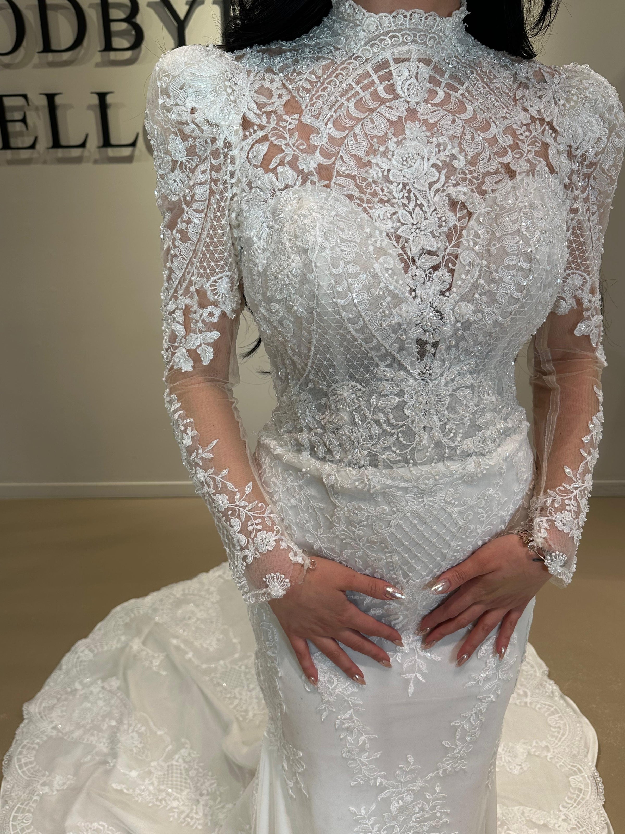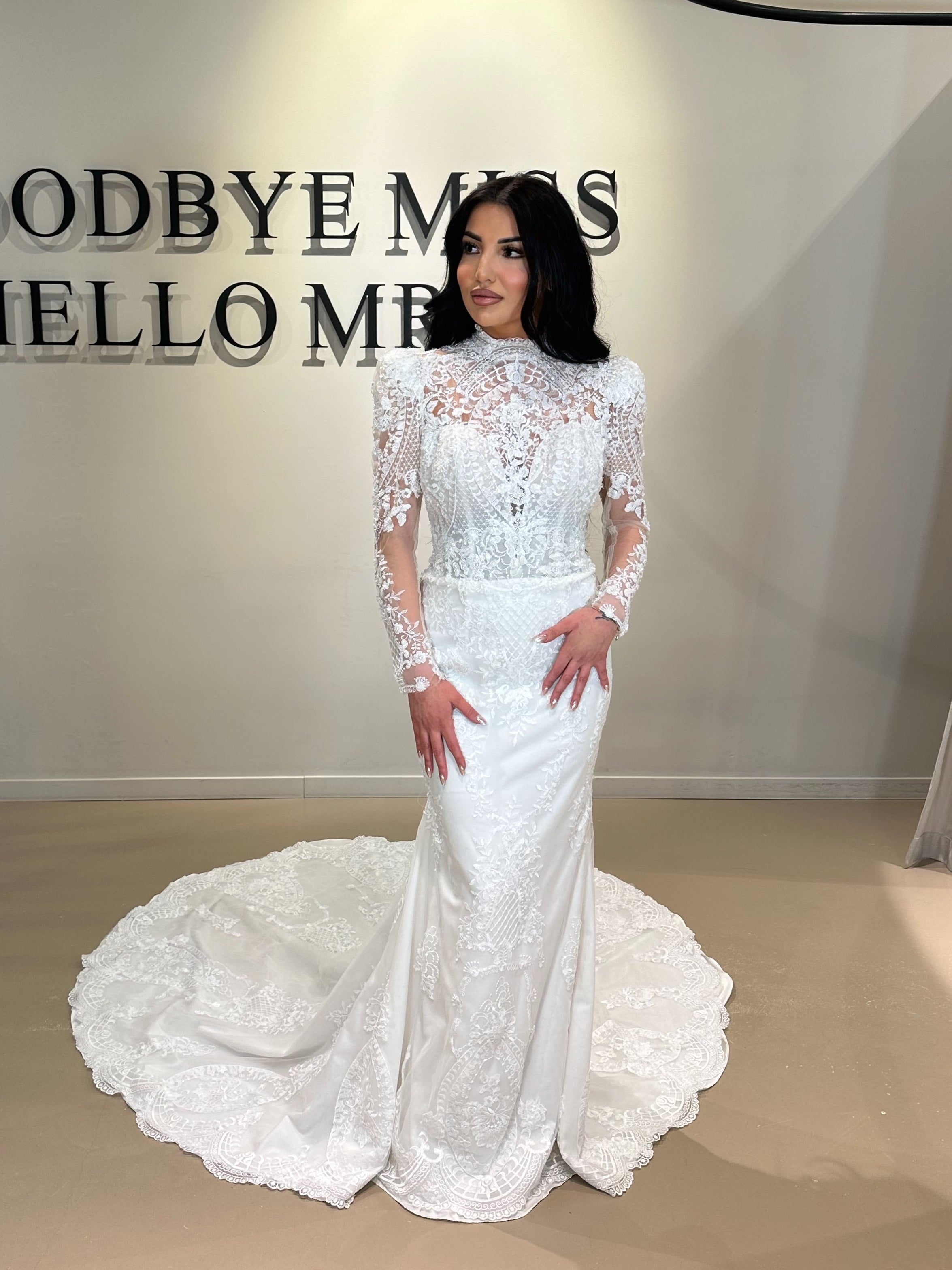 Leah is een trendy en elegante trompet bruidsjurk met een moderne col en verfijnd huidskleurig tule, wat zorgt voor een subtiele en luxe uitstraling. De jurk sluit prachtig aan op het lichaam en loopt uit in een vrouwelijk trompet silhouet. De indrukwekkende rug geeft de jurk een echte wow-factor.