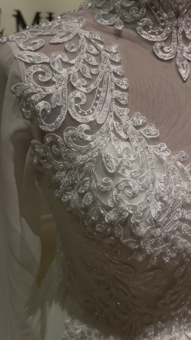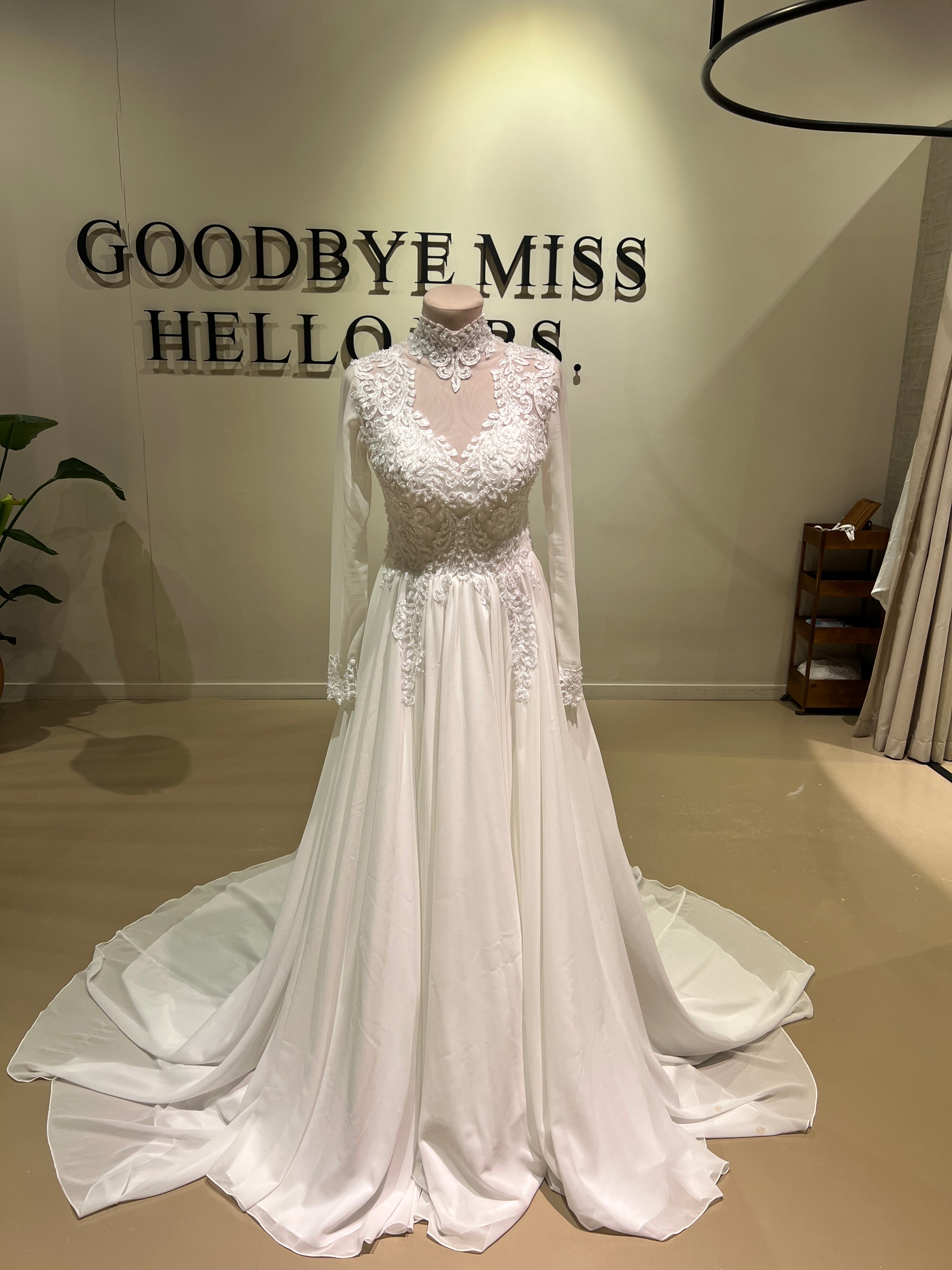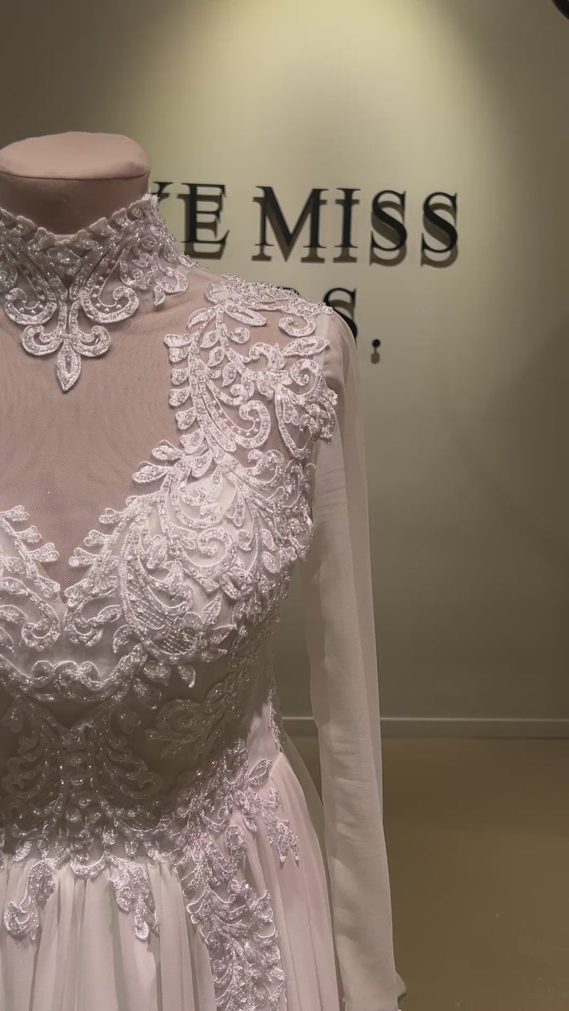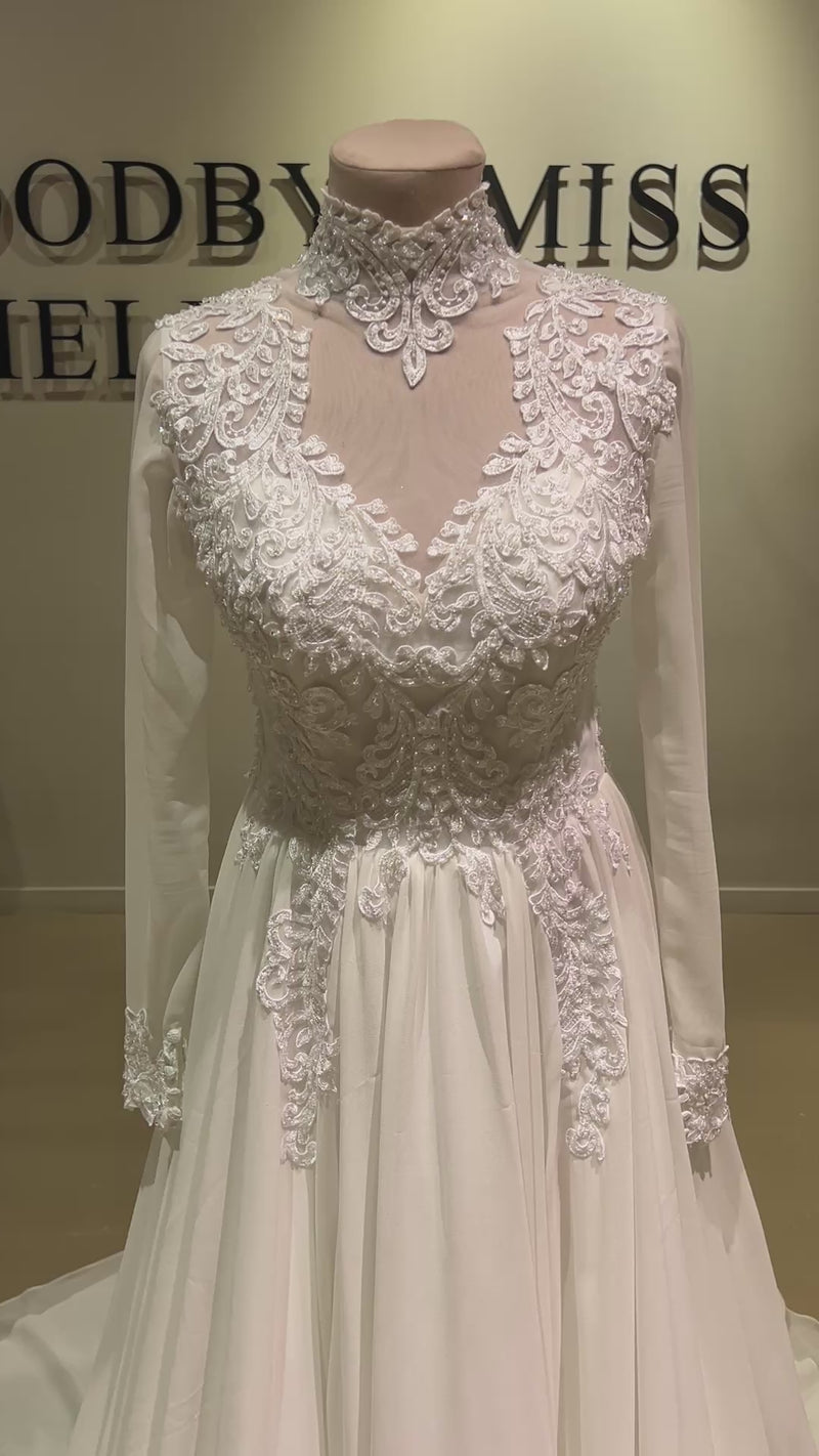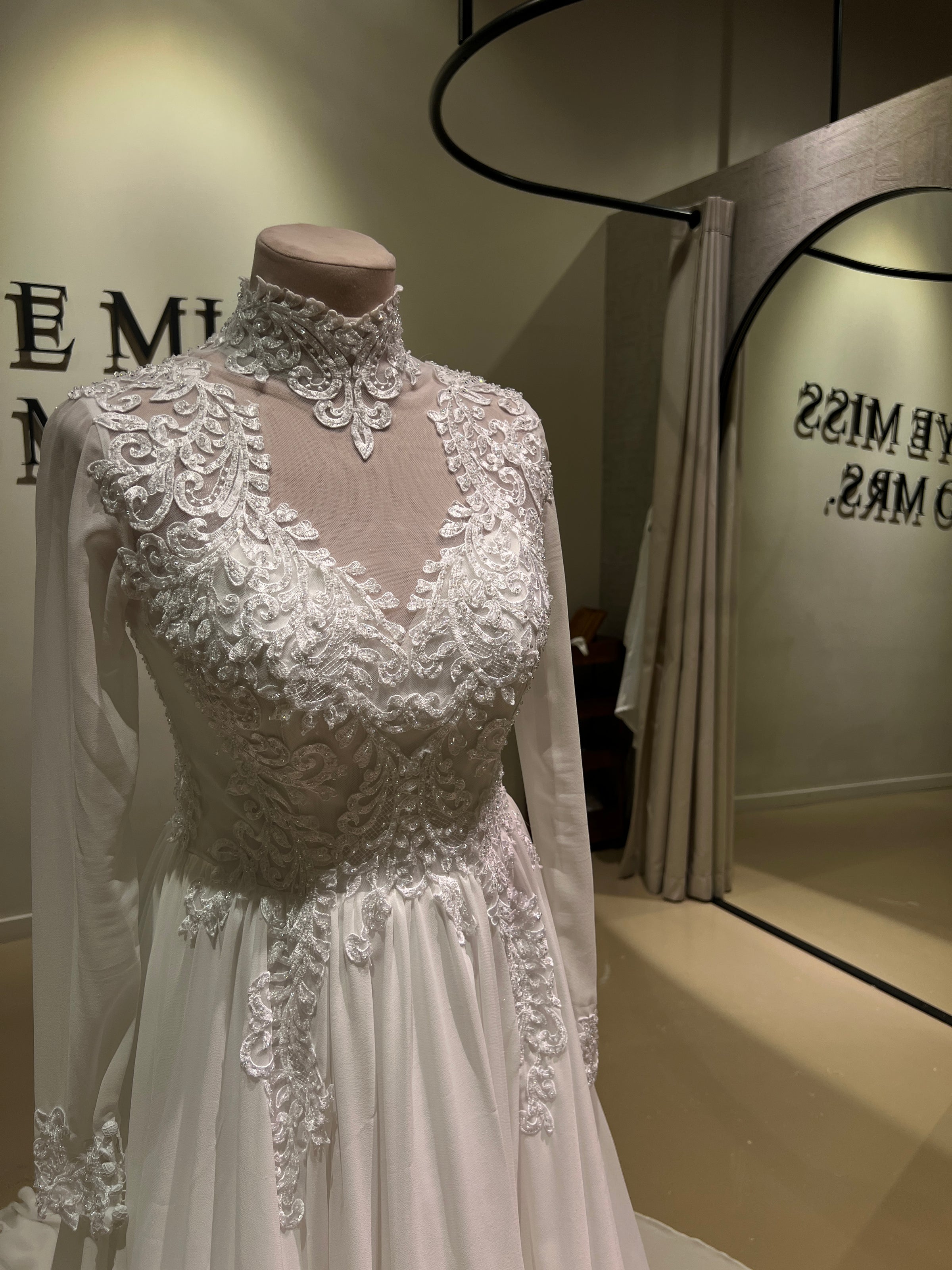 Safiya is de perfecte jurk voor een ontspannen, stijlvolle bruiloft. De hoge hals geeft haar een chique en moderne uitstraling, terwijl de luchtige chiffon rok soepel meebeweegt bij elke stap. Licht, elegant en comfortabel — ideaal voor een gemeentehuwelijk of een intieme viering.