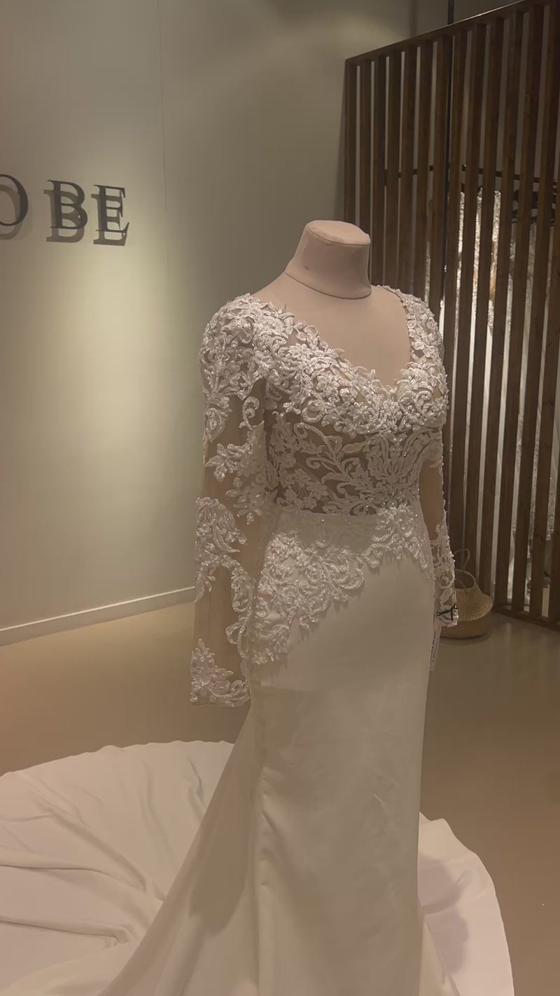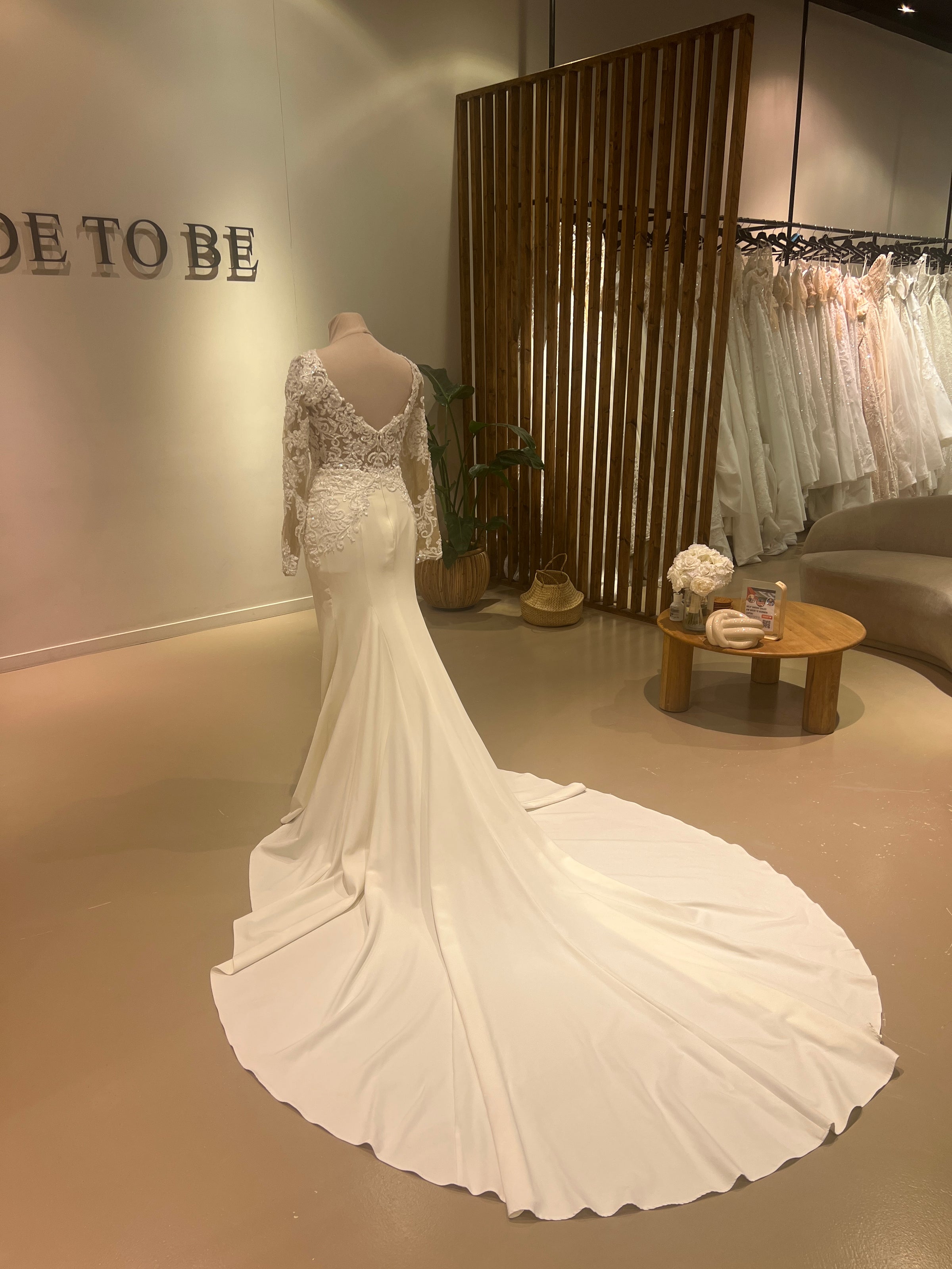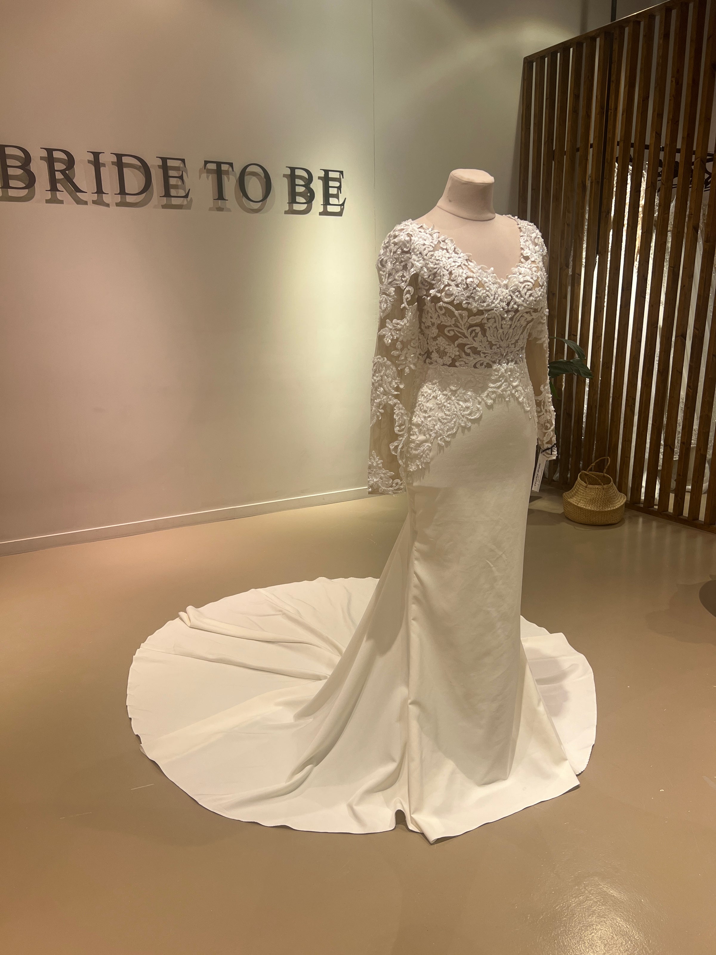 De bruidsjurk Toucha is een trompetvormige trouwjurk van crêpe en kant, met een elegante V-hals en lange mouwen. De jurk is maat 40 en in gedragen staat.