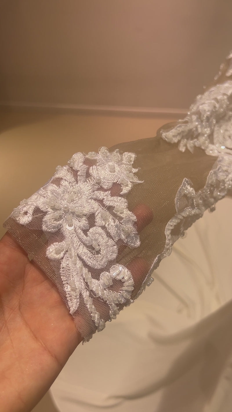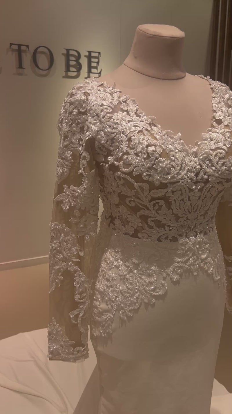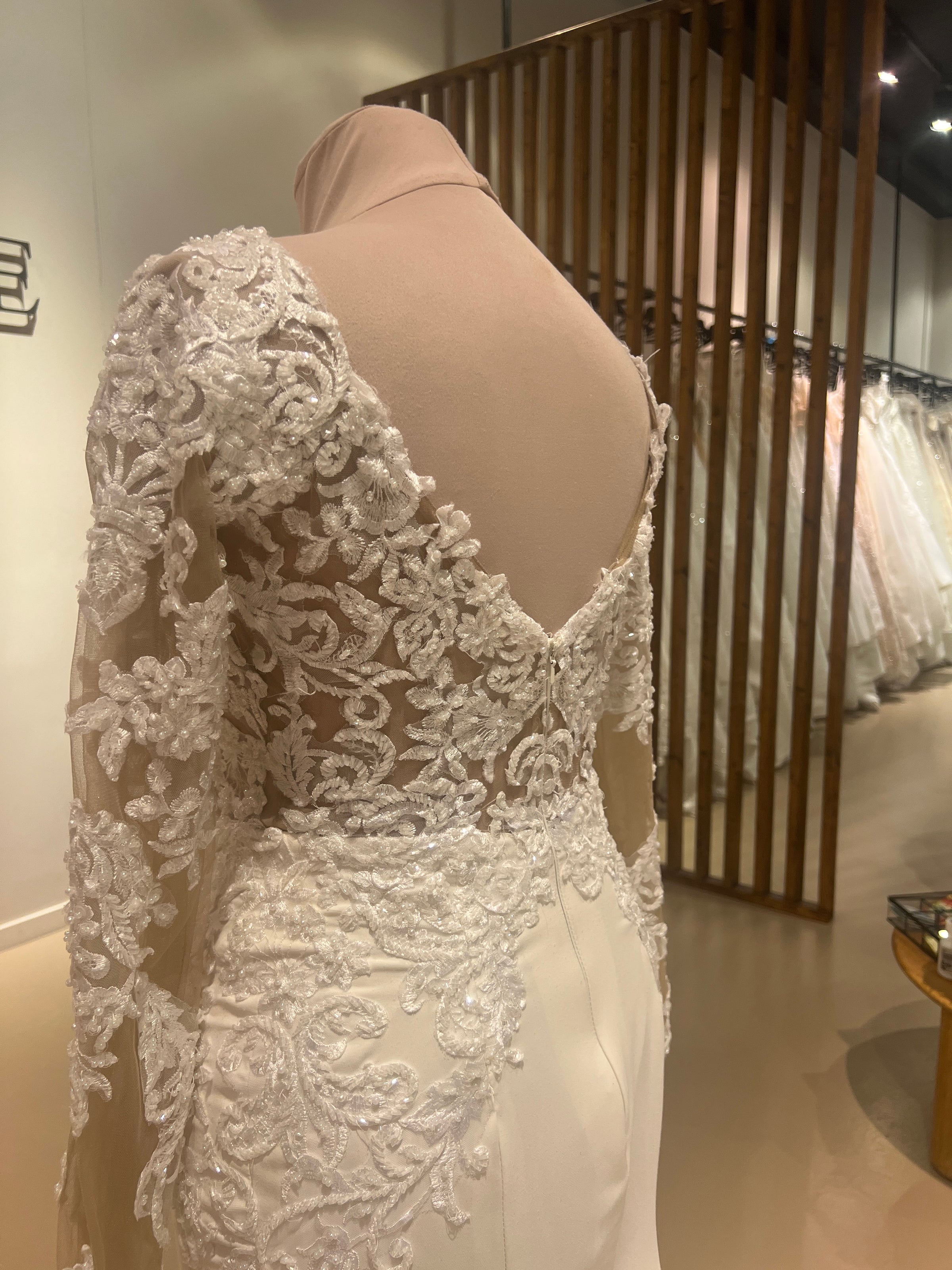 De bruidsjurk Toucha is een trompetvormige trouwjurk van crêpe en kant, met een elegante V-hals en lange mouwen. De jurk is maat 40 en in gedragen staat.